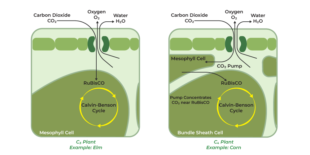 C4 is a specialized photosynthetic pathway that compartmentalizes the involved reactions. Unlike C3 plants, C4 species fix carbon dioxide into a four-carbon compound in mesophyll cells and then, transport it to bundle sheath cells, leading to higher efficiency. Due to their efficiency in hot environments, C4 plants are characterized as more drought-tolerant and climate-resilient than C3 plants.